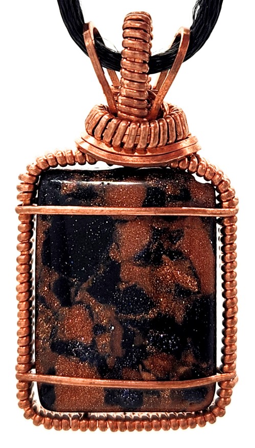 Make a wire woven bail around a rectangle piece of mixed goldstone using a combination of square and half round wire. Secure it in place with horizontal wires. Then make a fancy “crown” bail so you can hang this wire woven pendant from a chain or cord.
