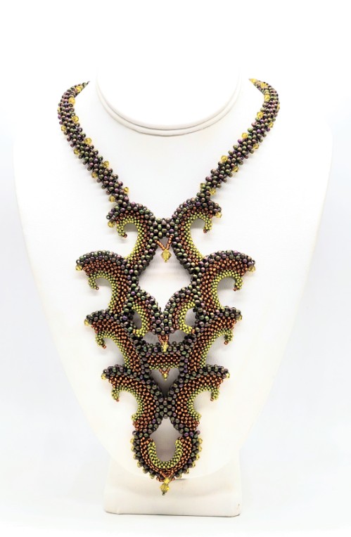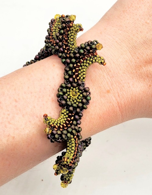 As if taking flight, this bracelet design by Karen Kubby has dimension and movement. It sits at the bone in the wrist and toggles closed with more Swarovski crystals. It measures 6.5″ around the wrist and is ready for your next event.